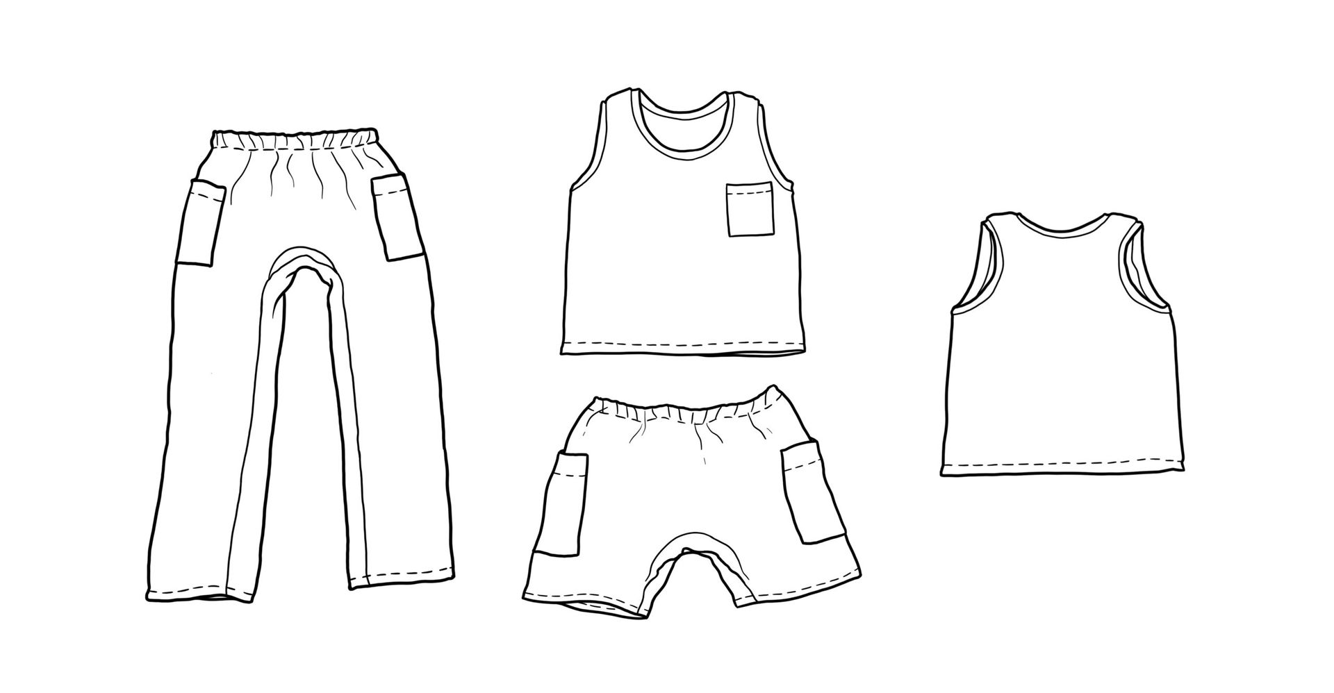 Matière : maille pour le débardeur comme jersey, interlock, French Terry fin, tissé pour le pantalon/short comme double gaze, popeline, tissu fluide…