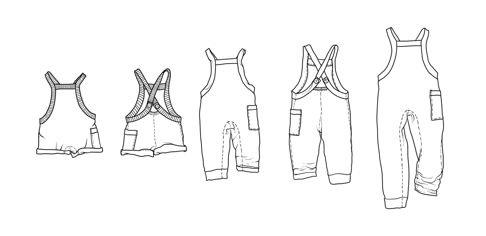 Cette salopette d’inspiration champêtre est réalisable en 3 longueurs de jambes ; une courte, une mi longue à hauteur de mollet ainsi qu’une extra longue avec la possibilité de poser un élastique, un revers simple ou une bande.